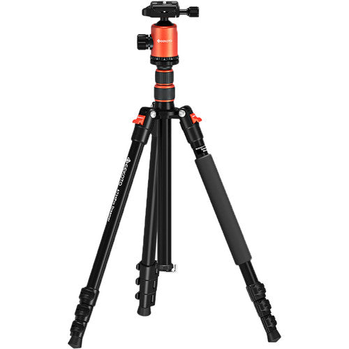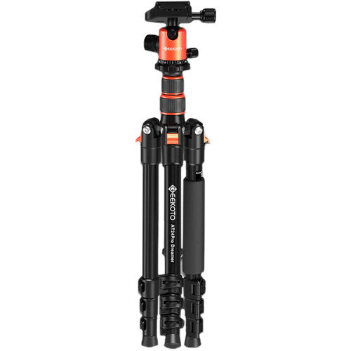 The GEEKOTO AT24Pro Dreamer 77" Aluminum Tripod expands to this maximum height by unlocking the flip leg locks and extending the four-section legs along with the two-section rapid center column. With the tripod's three variable leg angles, you can splay the legs completely out to a minimum height of 19", but the center column is reversible, so you can get even closer to the ground if needed. The 3.4 lb support includes an Arca-type ball head that has a load capacity of 17.6 lb and has a quick release plate with a 1/4"-20 threaded camera mount. The leg with the foam grip is detachable and attaches to the removable center column, which has two sections, to become a working monopod with six sections. To store or transport the tripod, the legs fold in the reverse to a compact size.