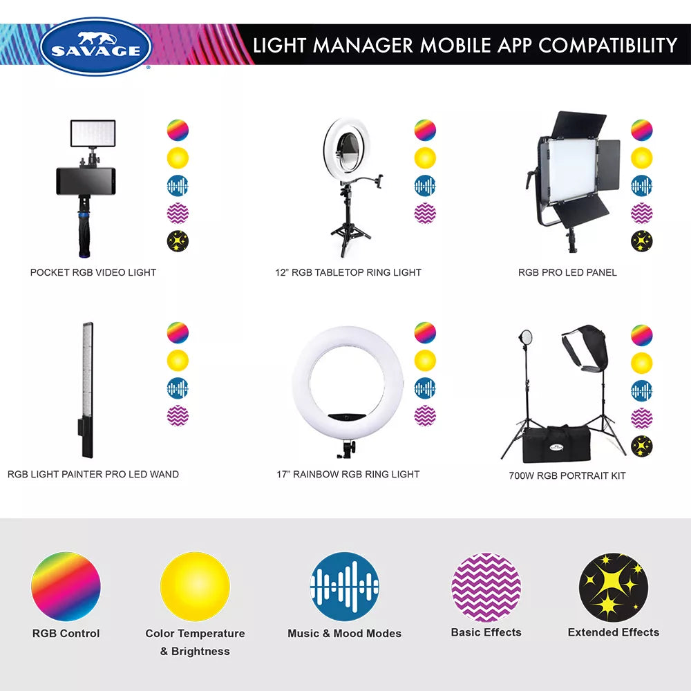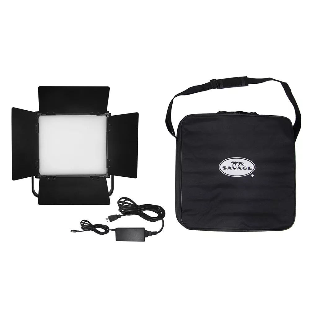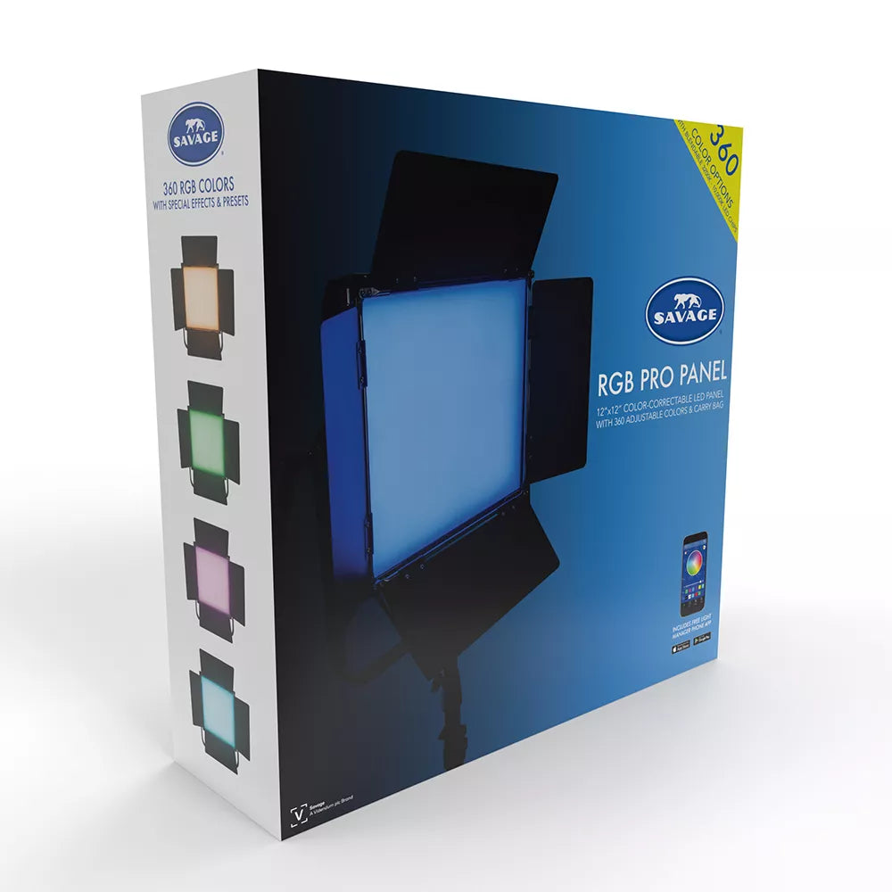 The Savage RGB Pro Panel is a soft light panel that can handle any need for photo or video! Whether you need to select from 360 separate and distinct colors, fine-tune color temperature accuracy or even dramatic special effects, this LED panel can take on the job. Our unique 3 chip LED design allows us to use both CRI 97 amber and white chips (RGB + W + A) so that color accuracy does not degrade as the temperature is adjusted. Control the light using the back panel digital readout, our free Savage Light Manager mobile app (through the Apple App Store or Google Play Store) or via DMX. Power the panel with the included AC power cord or via Savage’s Power Lithium Ion V-Mount Battery (sold separately).