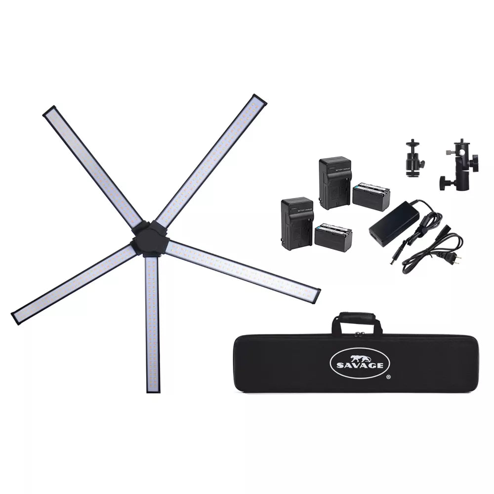 Steplessly adjust to any color temperature between 5500K and 3200K to match ambient light in any room easily via the free Savage Light Manager mobile application (available on the Apple App Store and Google Play Store.) Experiment with different angles and the distance of your subject from the light for varying twinkle effects, or adjust the positioning of the LED panels for different catchlight shapes. Included batteries provide 70 minutes of runtime at full power, or use the AC power cord for longer sessions. Foldable and compact, the Savage Star Light transports and stores safely with a molded carry case.