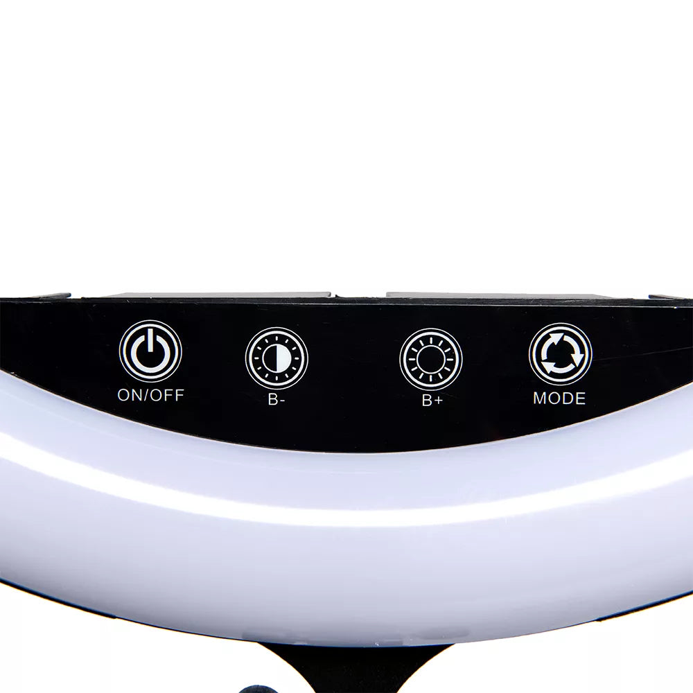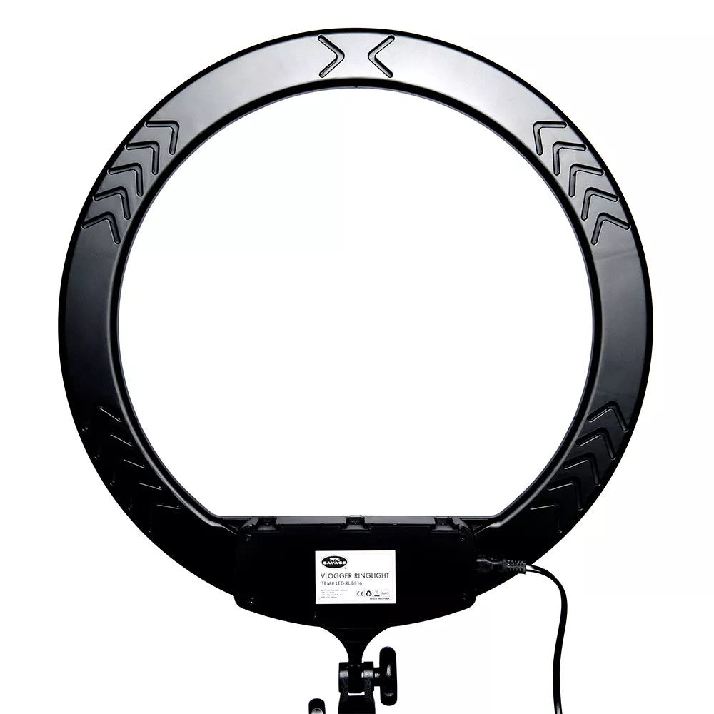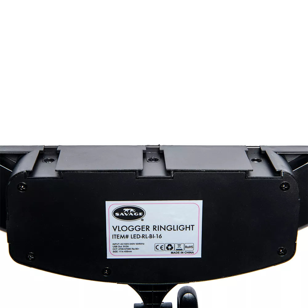The Savage Vlogger Ring Light provides flattering and even light for Youtubers and vloggers while creating desirable round catchlights in the subject’s eyes. The diffused front softens the LED output while reducing harsh shadows. Produce seamless makeup applications while filming beauty tutorials using the included mirror. Two included mobile phone holders with adjustable arms allow streaming from multiple devices. Control settings are in the front where you need them! This ring light has color temperature presets between 5700K and 3200K, enabling the user to select if they prefer a cool, warm or blended output.