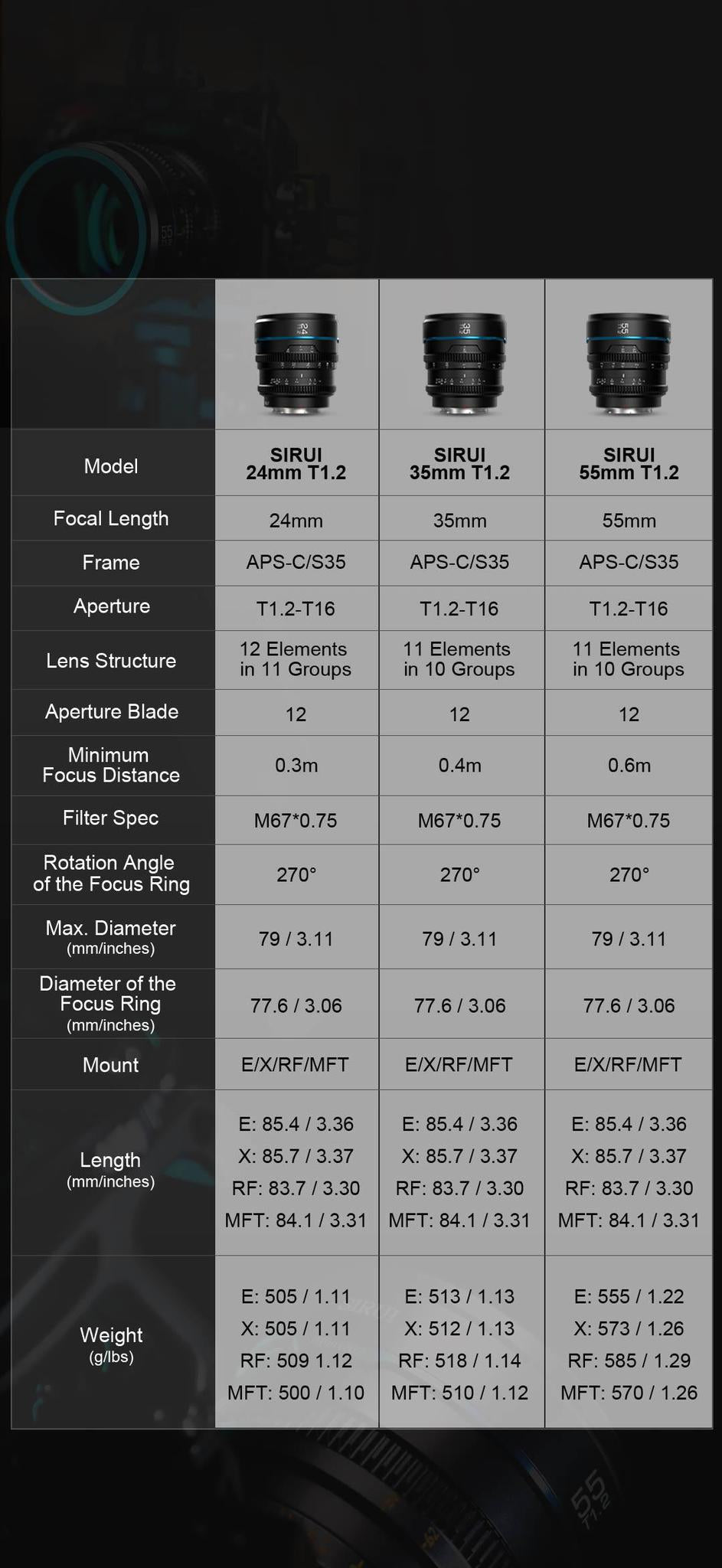 SIRUI Night Walker T1.2 Super35 Frame Cine Lens Series 3 lens kit for Sony E-Mount